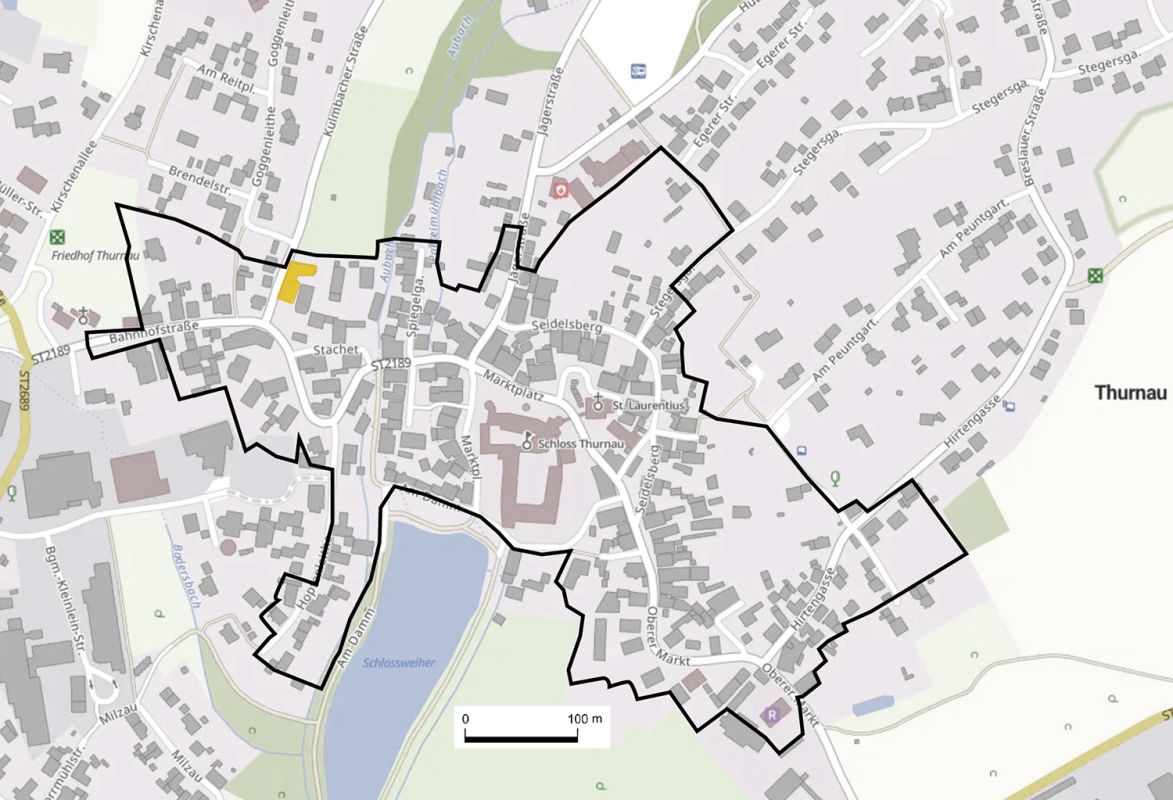 Ergebnisbericht ISEK Thurau S.89; gestrichelte Linie: Geltungsbereich des kommunalen Förderprogramms; gelb markiert: Weißer Schwanen - Planer: RSP Architektur + Stadtplanung GmbH - März 2024